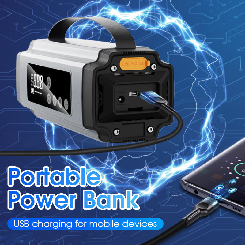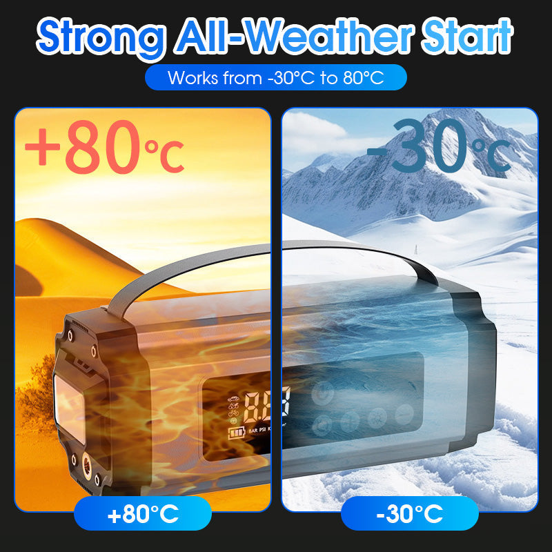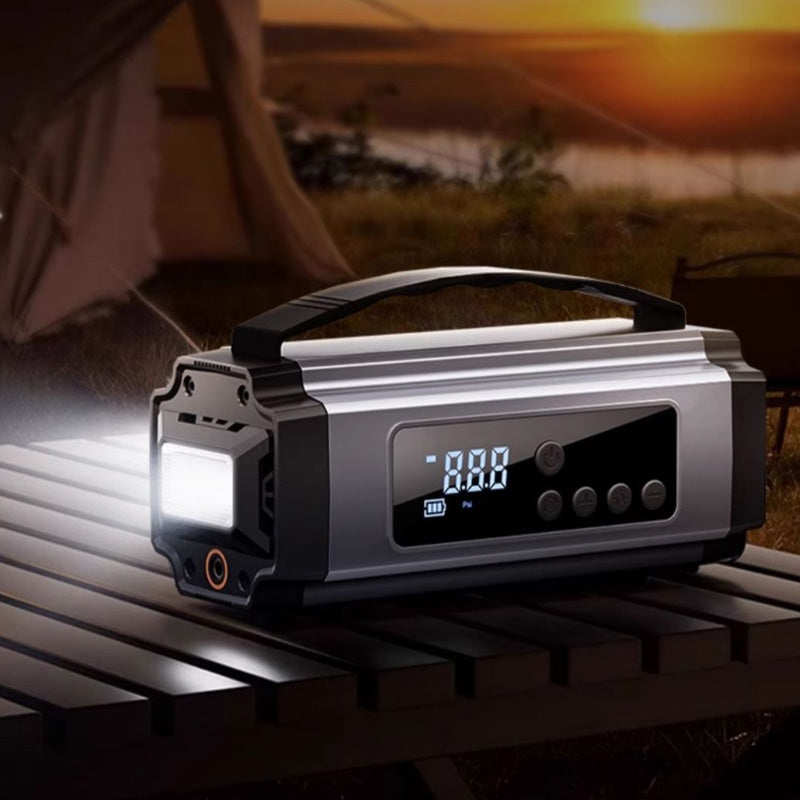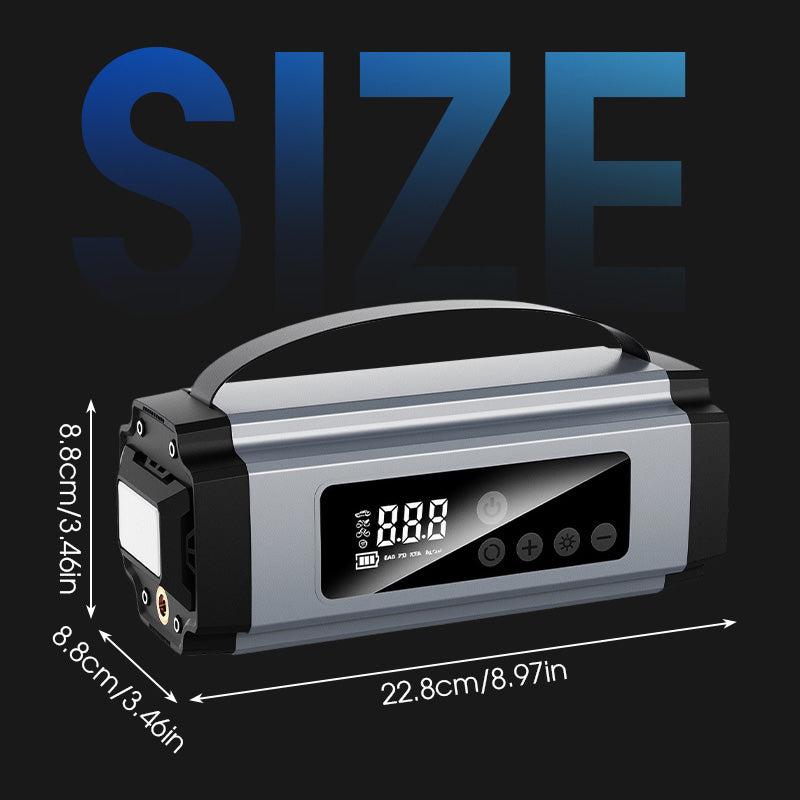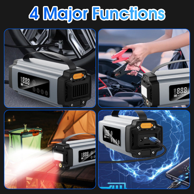 DUBBELE FUNCTIE: Combineert een krachtige starthulp voor auto's met een slimme luchtcompressor in één compact apparaat. Perfect voor noodstarts van de motor en het oppompen van banden, zodat u altijd voorbereid bent op pech of lekke banden tijdens het reizen.