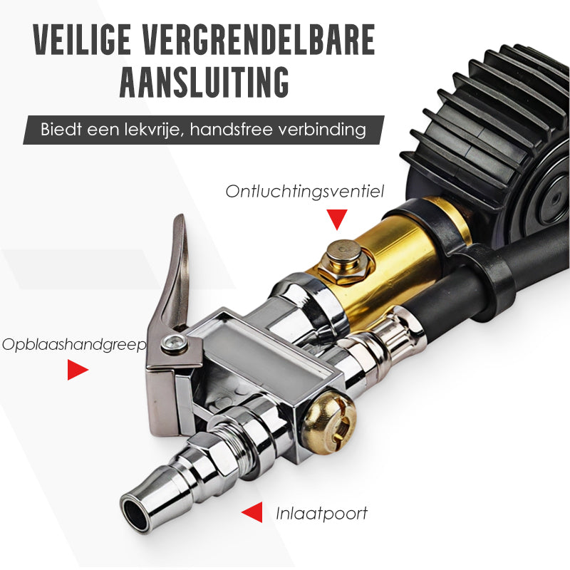 VEILIG VERGRENDELBAAR KOPPELINGSONTWERP : De vergrendelbare koppeling zorgt voor een veilige, strakke verbinding met het bandenventiel, waardoor handsfree bediening mogelijk is. Dit ontwerp is zowel compact als flexibel, waardoor het gemakkelijk te gebruiken is in krappe of moeilijk bereikbare plaatsen.